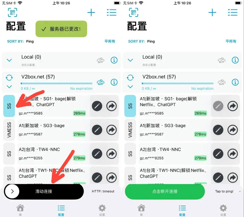 5、选中一个节点后,节点前面的颜色会变成淡蓝色,会提示”服务器已更改!“,在把”滑动连接“向右滑动,”滑动连接“的背景颜色从黑色变成绿色,并且字体变成”点击断开连接“,这时候你就打开了V2box代理开关,成功使用v2box挂梯子进行魔法上网了。
