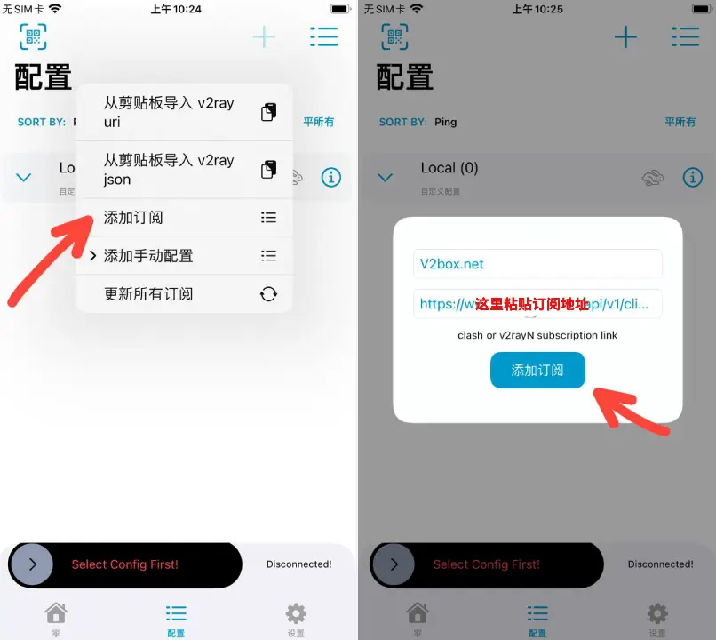 4、点击——添加订阅,如下图的位置粘贴订阅地址,然后点击——添加订阅
