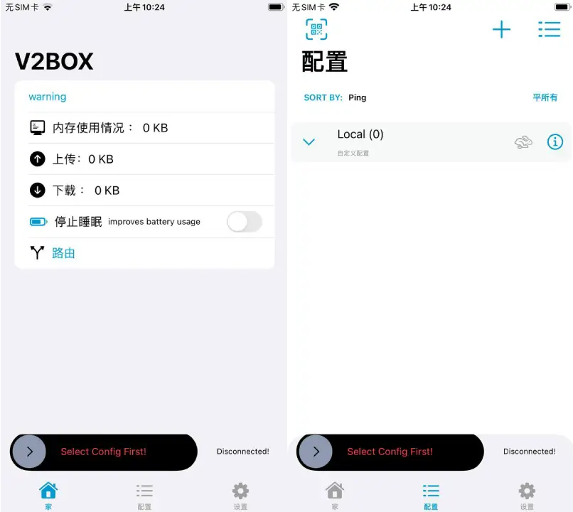 3、安装好后,打开v2box界面如下图,我们点击——配置,点击右上角的”+“号